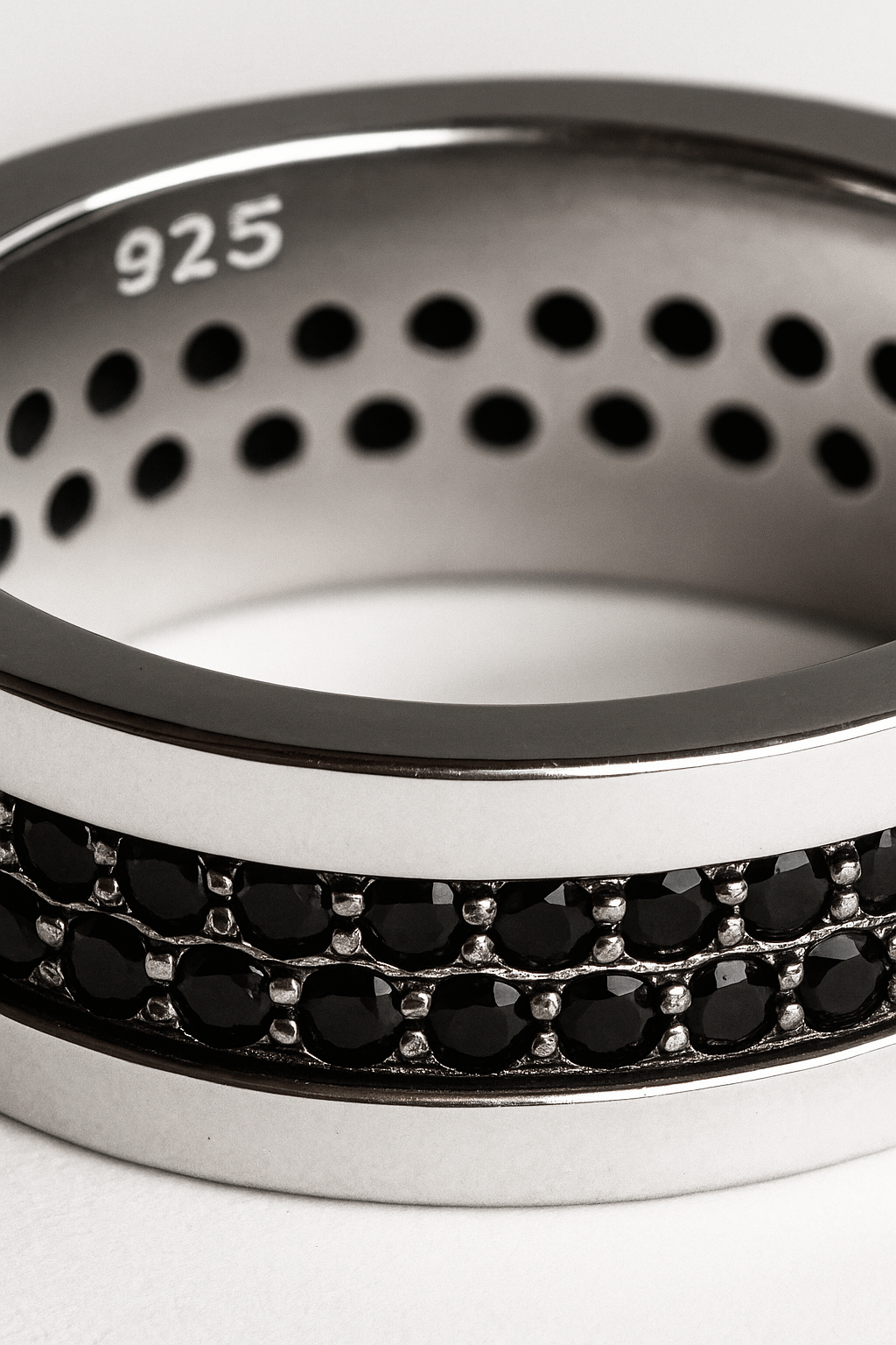 El Anillo de Circones Negros es la pieza definitiva para quienes buscan una joya con un diseño sofisticado y moderno., elaborado en Plata 925, su banda lisa y robusta está adornada con circones negros que capturan la luz y añaden un brillo sutil pero impactante a esta pieza.