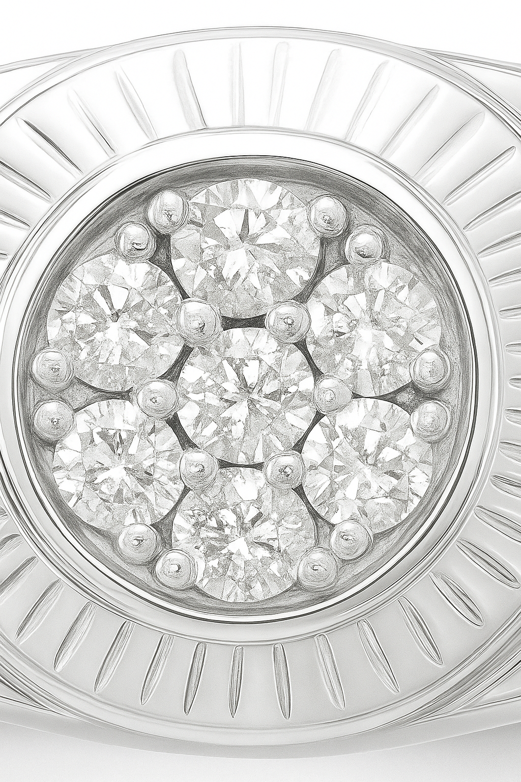 Un anillo fabricado en Oro 18k, este diseño se centra en un motivo central con múltiples diamantes o circones que irradian brillo y sofisticación.