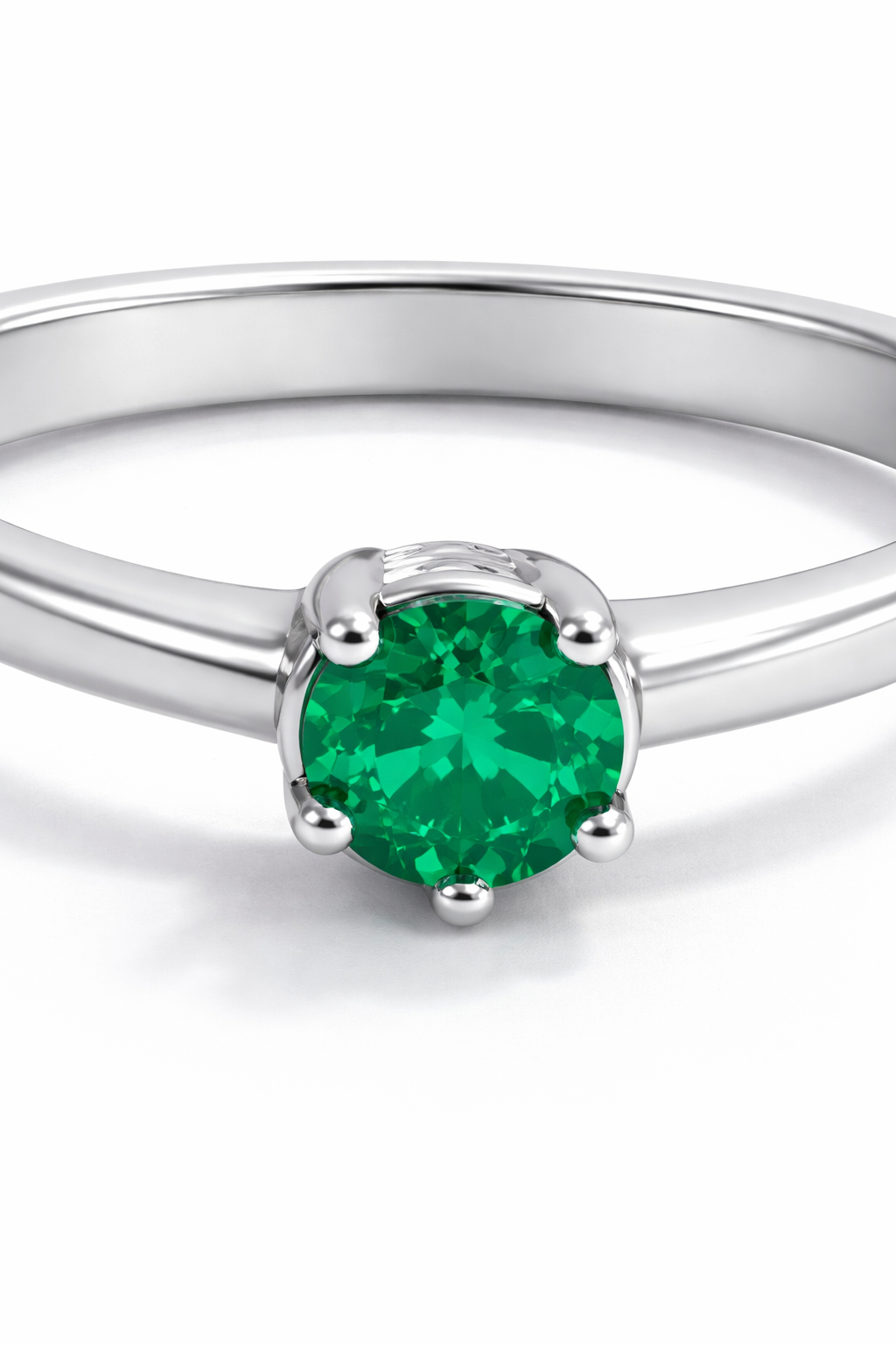El Anillo Esmeralda está elaborado en oro blanco de 18K y protagonizado por una esmeralda central de intenso color verde, símbolo de renovación, equilibrio y amor eterno.