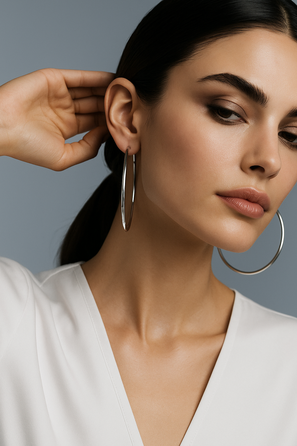 Su estructura ligera, pulida y con un tamaño total de 50 mm, refleja la luz de manera sutil, adaptándose tanto a un look diario como a una ocasión especial.