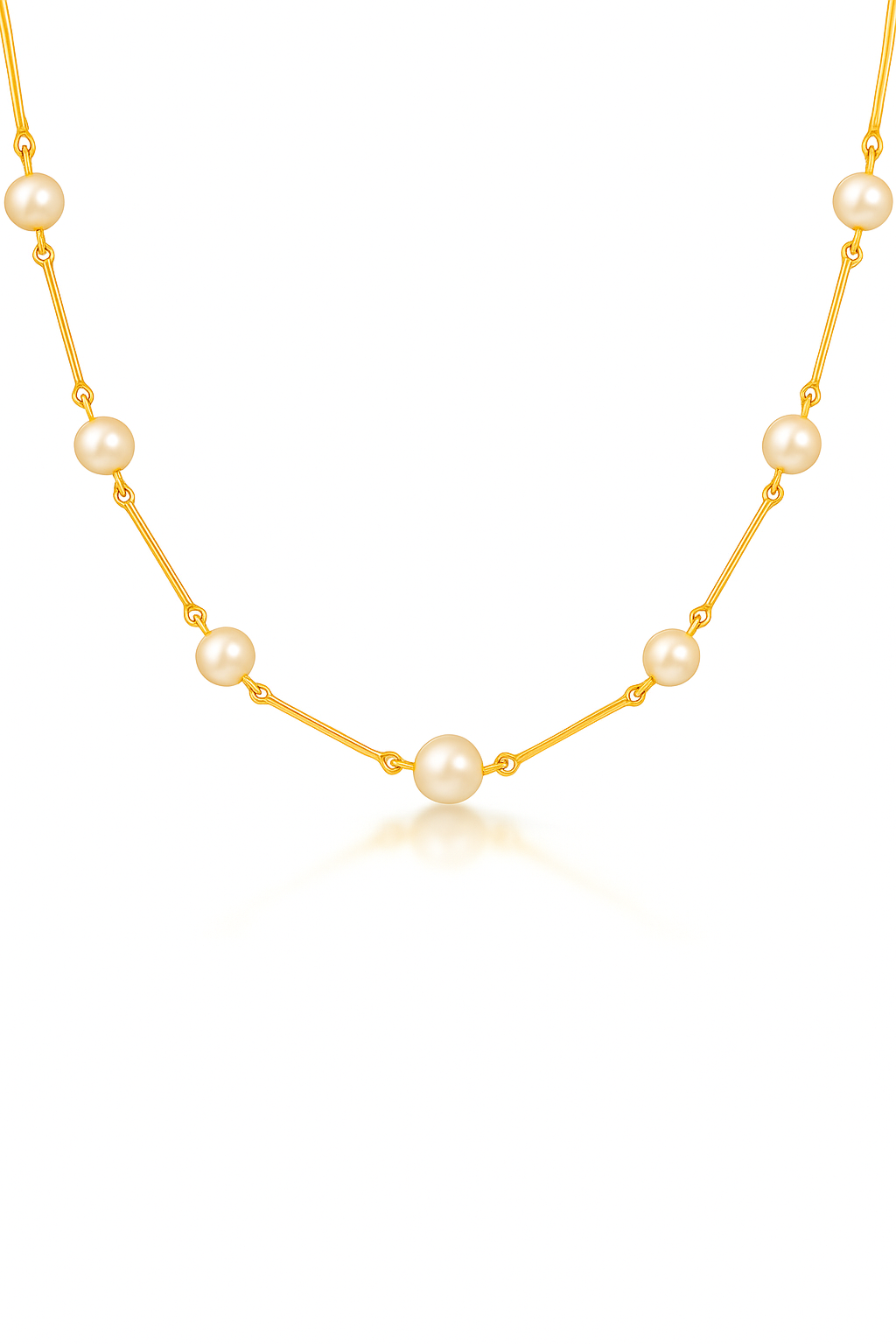 El Collar Modelo Éden está elaborado en Oro 18k con delicados tramos lineales que enmarcan 7 perlas cultivadas de 5,5 mm seleccionadas por su pureza y luminosidad en un collar de 50 cms.