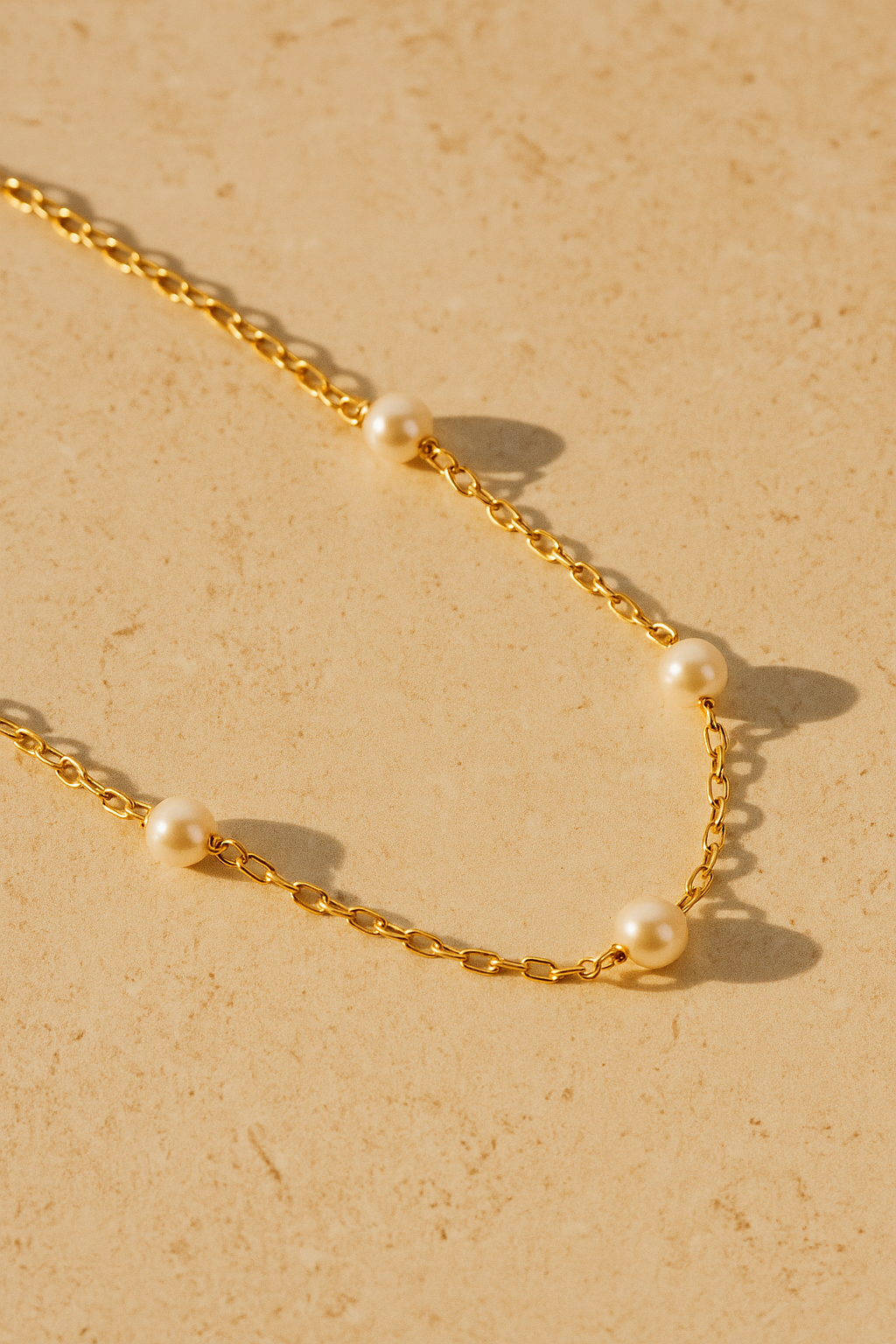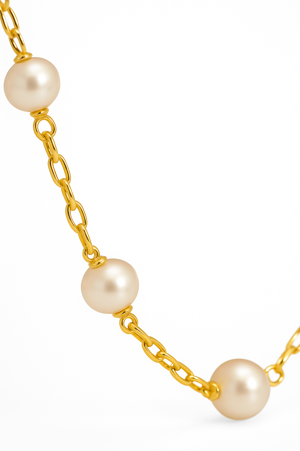 El Collar Modelo Isolde está elaborado en Oro de 18k, con una delicada gargantilla eslabonada que integra 7 perlas cultivadas de 4 mm seleccionadas por su brillo y delicadeza natural.