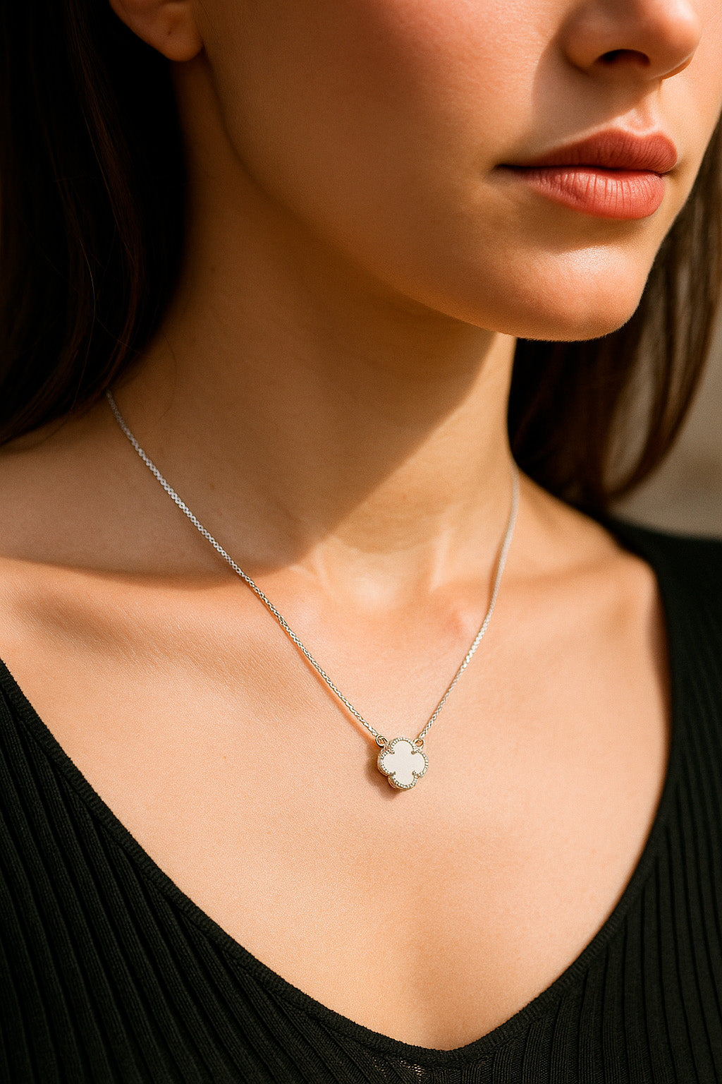 El collar Trivium combina la delicadeza de la cadena veneciana con la elegancia de su trébol central. Elaborado en plata 925, está disponible en dos versiones: nácar natural, que refleja luminosidad perlada, y ónix negro, símbolo de fuerza y distinción.