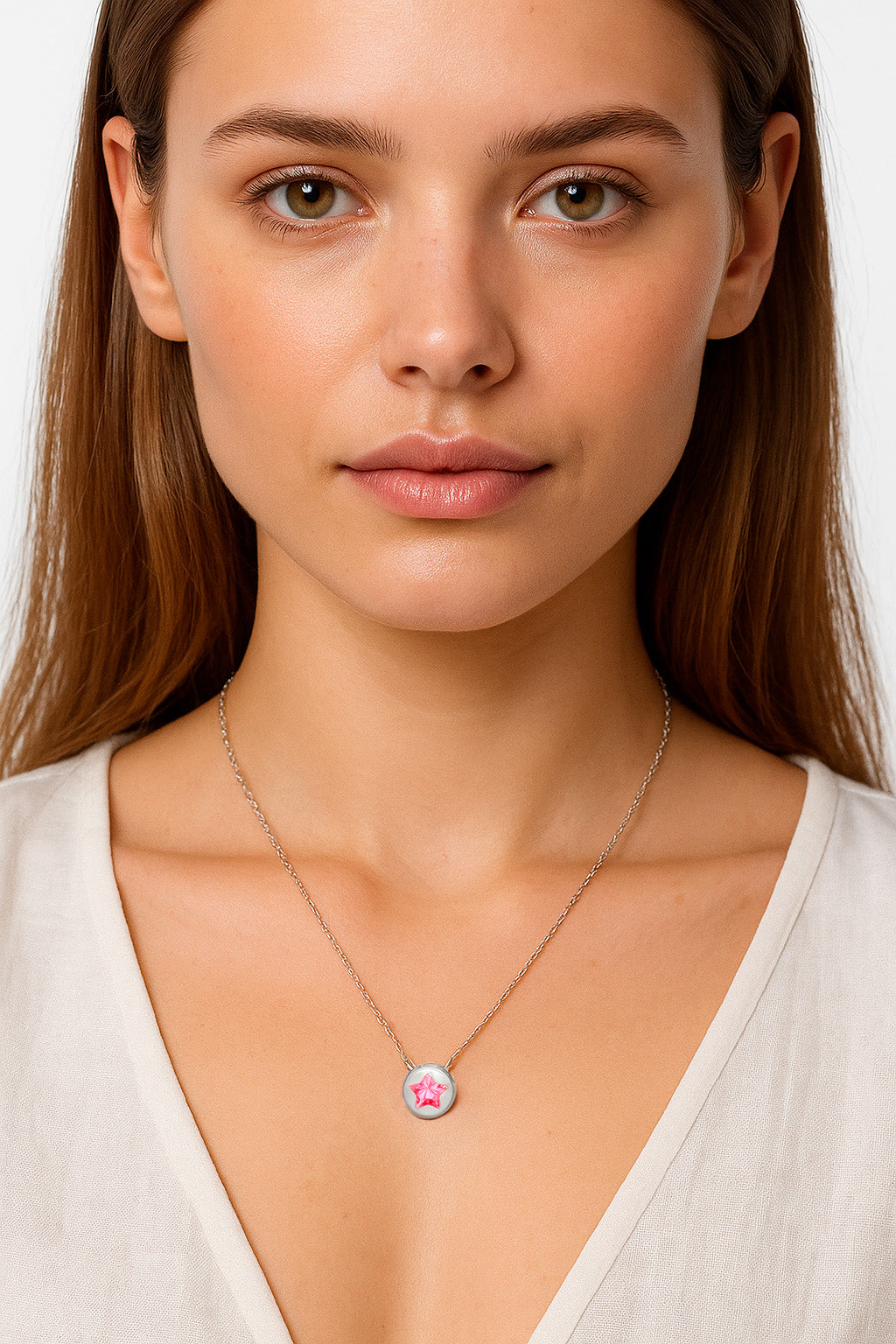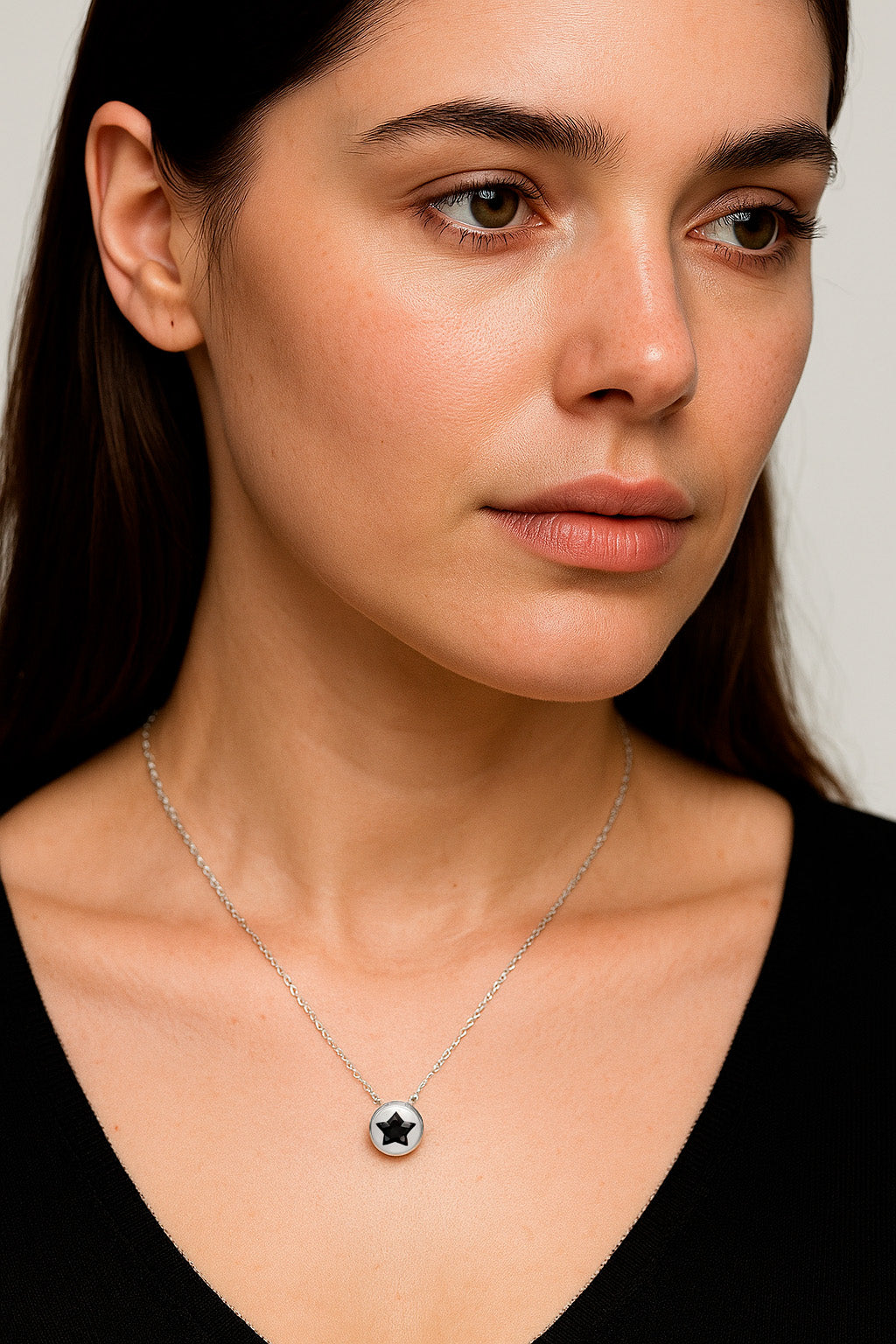El Conjunto Stellaris ilumina cualquier look con un brillo sutil y moderno. Fabricado en Plata 925, presenta un dije circular que enmarca una estrella de circones facetados, disponible en tres tonos para elegir: negro, blanco o rosa.