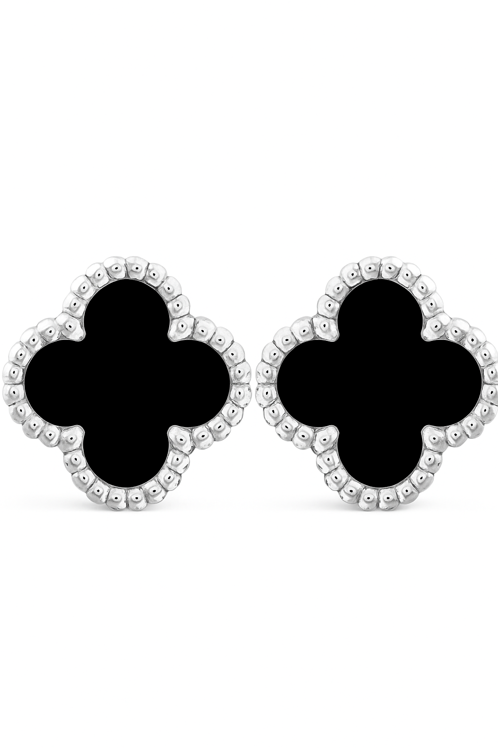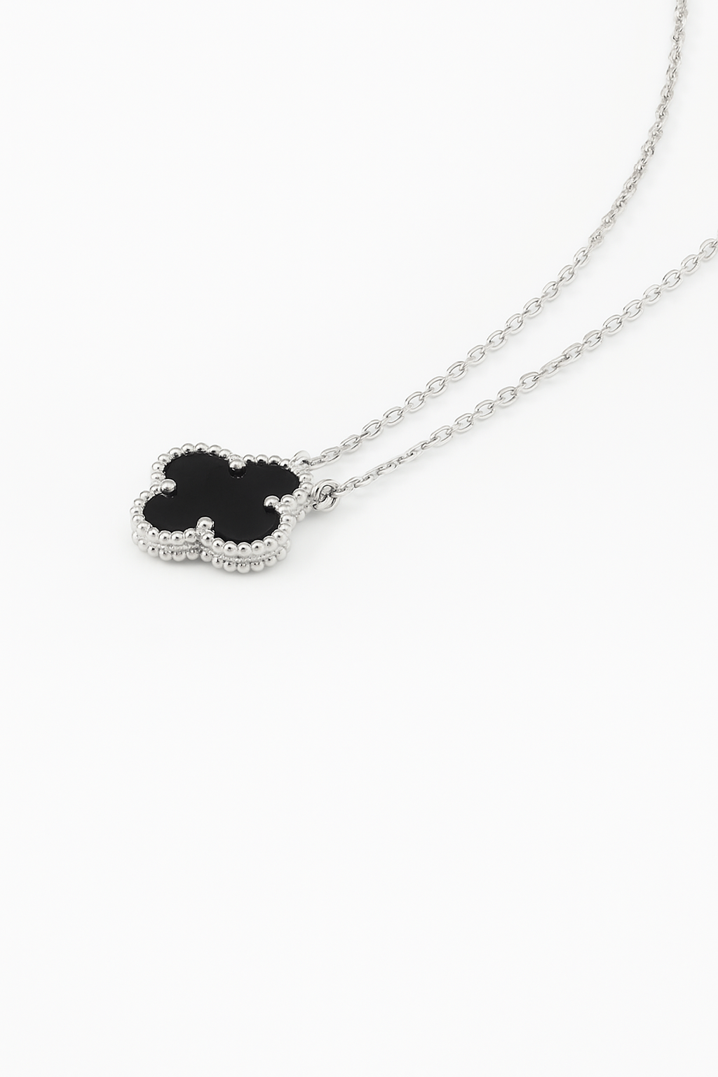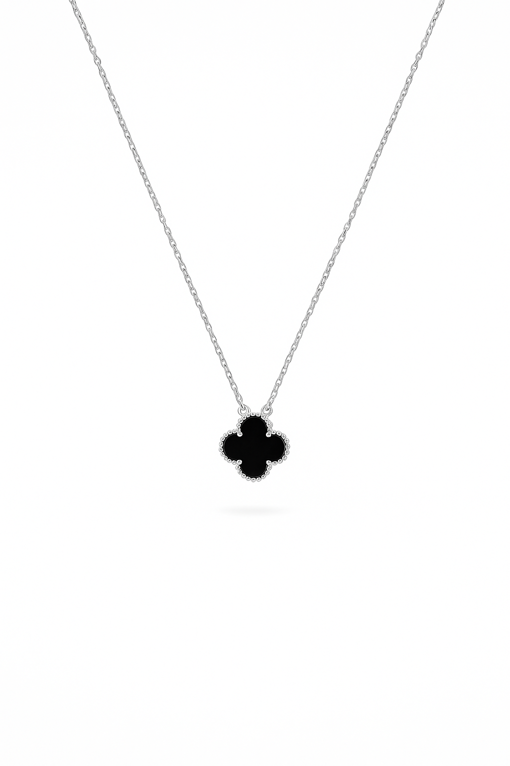 El conjunto Onira es una declaración de sofisticación y encanto, elaborado en Plata 925, está compuesto por un collar y un par de aros en forma de trébol, realzados con ónix natural en el centro y un delicado borde de circones brillantes que aportan contraste y luminosidad.