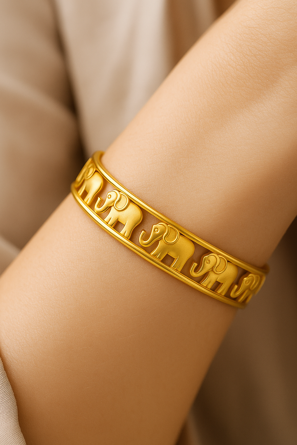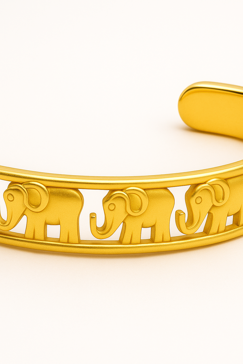La Pulsera Indira es una joya cargada de simbolismo y estilo., elaborada en oro de 18k, presenta una delicada sucesión de elefantes en relieve, representando fuerza, buena fortuna y protección.
