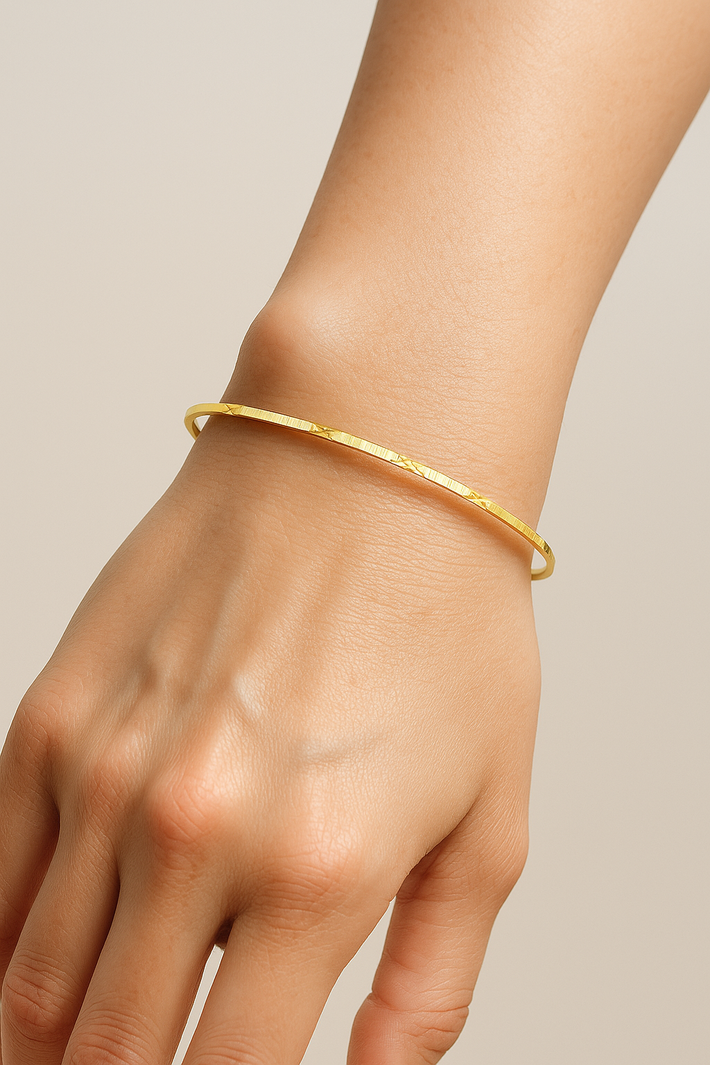 La Pulsera Aura es una joya que encarna la sencillez y la elegancia atemporal. Su diseño elaborado em Oro de 18k con delicados grabados en relieve crea destellos de luz que realzan su estilo minimalista.