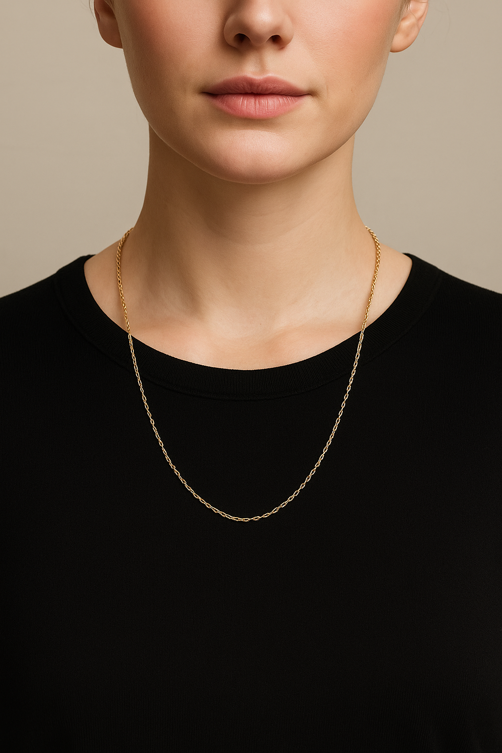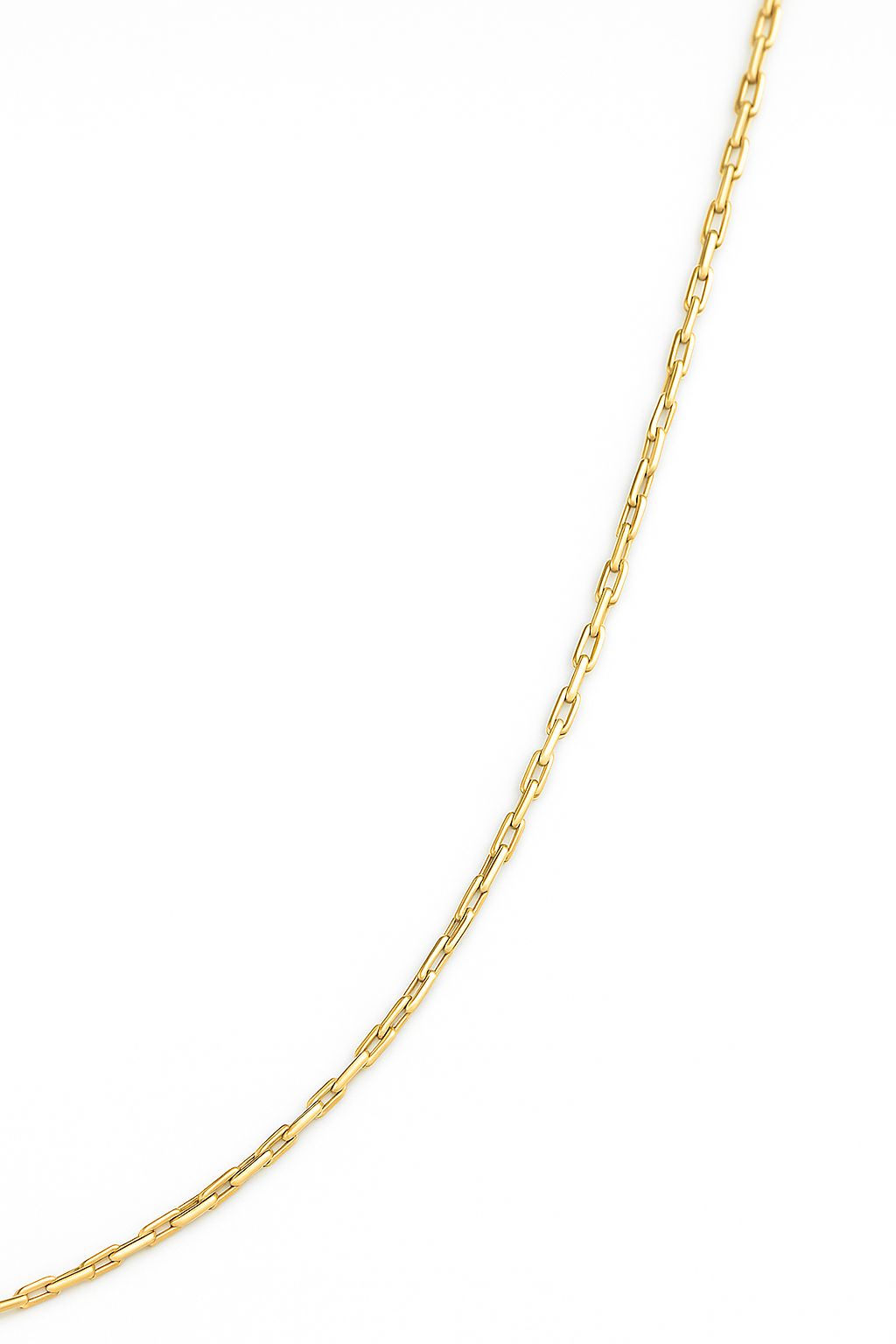 La Gargantilla Arlen en Oro 18K es una pieza unisex diseñada para quienes buscan elegancia sutil y calidad auténtica. Gargantilla eslabonada de 53 cm ofrece una caída liviana, cómoda y sofisticada, destacando el brillo cálido y profundo del oro real.