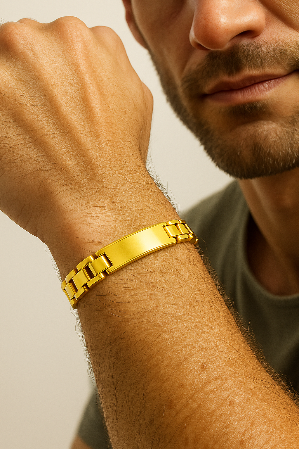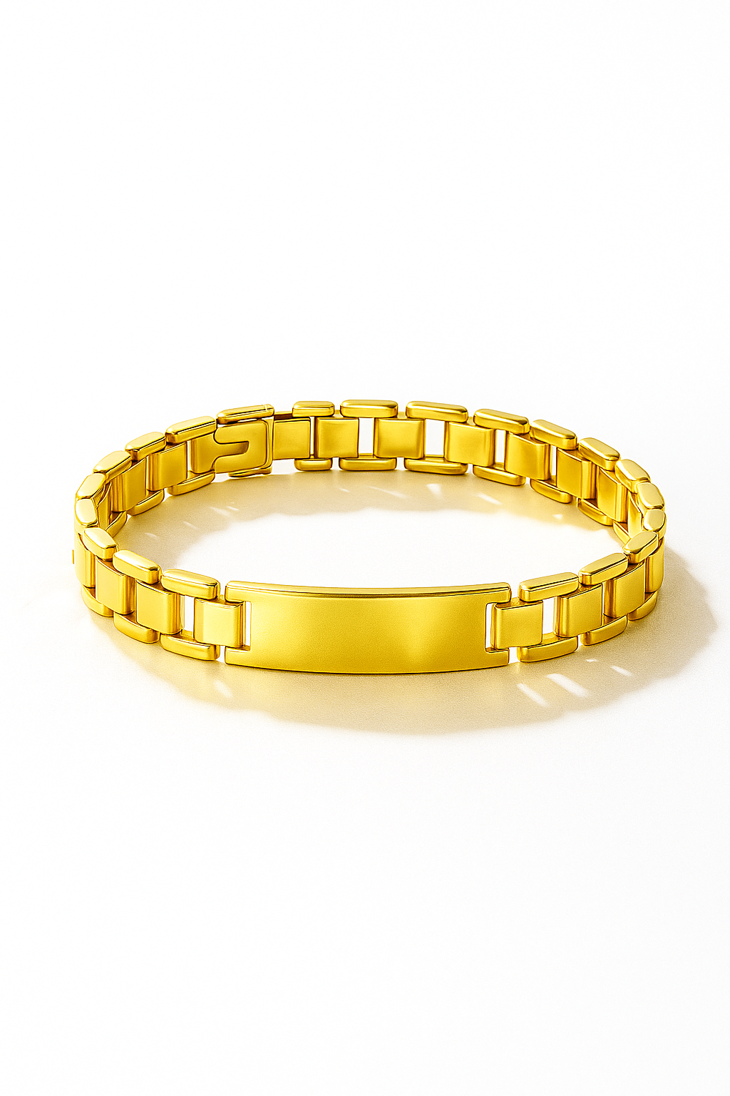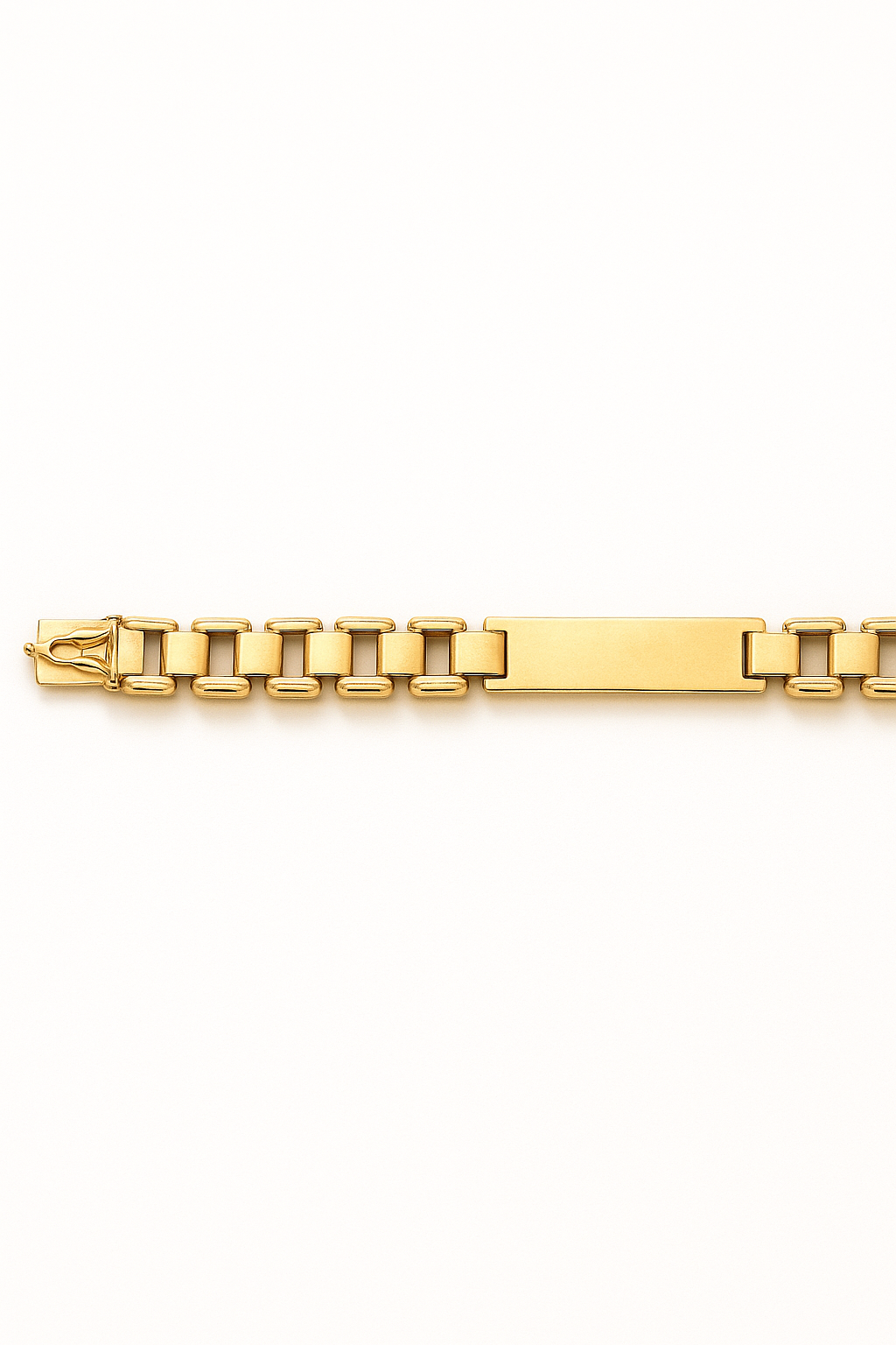 Su diseño de eslabones rectangulares elaborados en Oro de 18k se complementa con una placa central sólida, ideal para personalizar con un grabado especial.