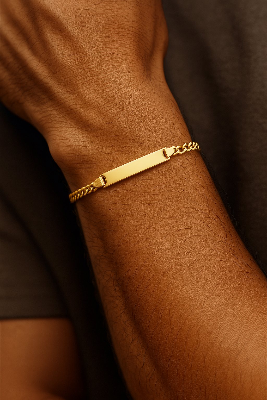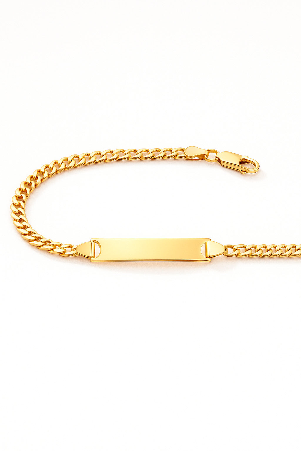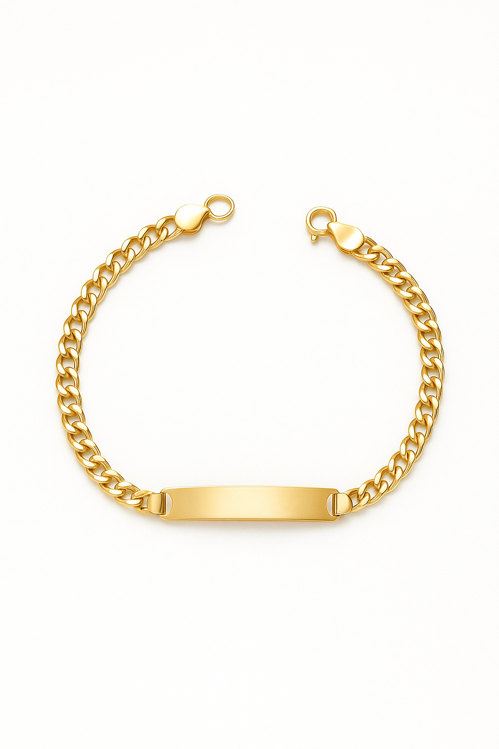 Su placa central en oro ofrece un espacio perfecto para grabar iniciales, fechas o mensajes significativos, mientras la cadena tipo barbada aporta un toque clásico y versátil.