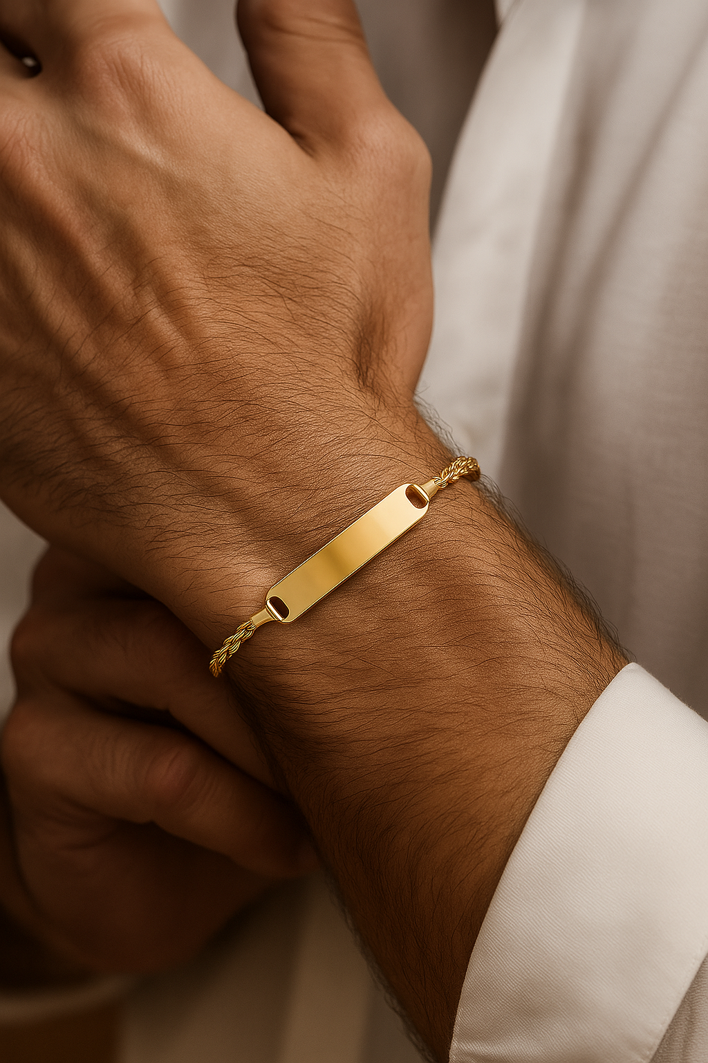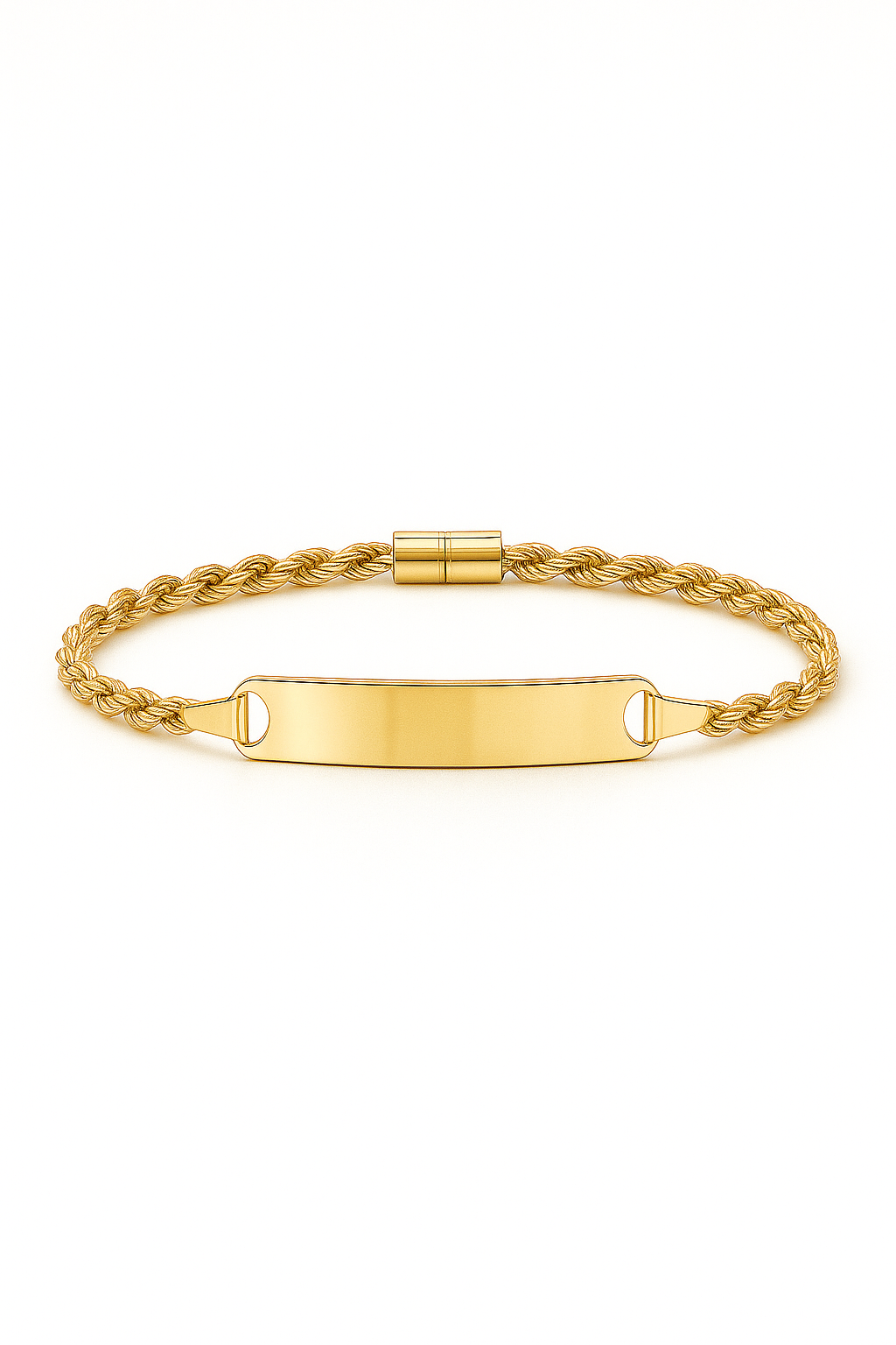 La Pulsera León elaborada en Oro de 18k es un símbolo de fuerza y carácter, diseñada en oro con estilo Tourbillón y placa central para un grabado personalizable.
