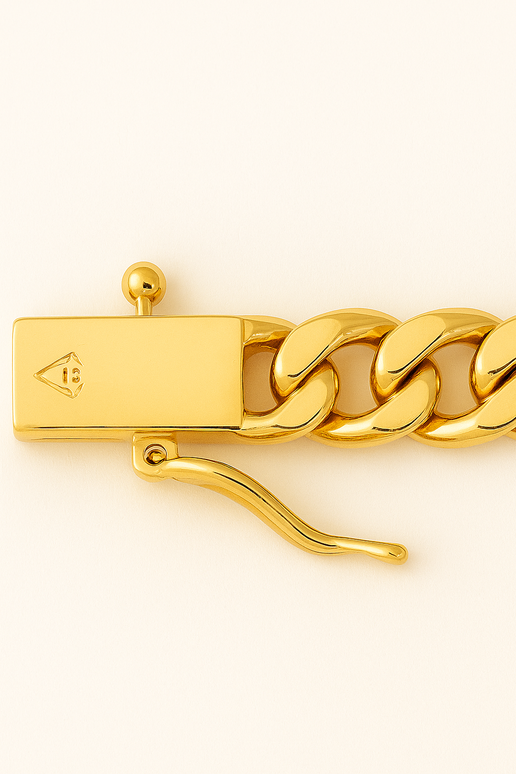 Con su diseño de eslabón cubano elaborados en Oro de 18k, transmite solidez, fuerza y sofisticación en cada detalle.
