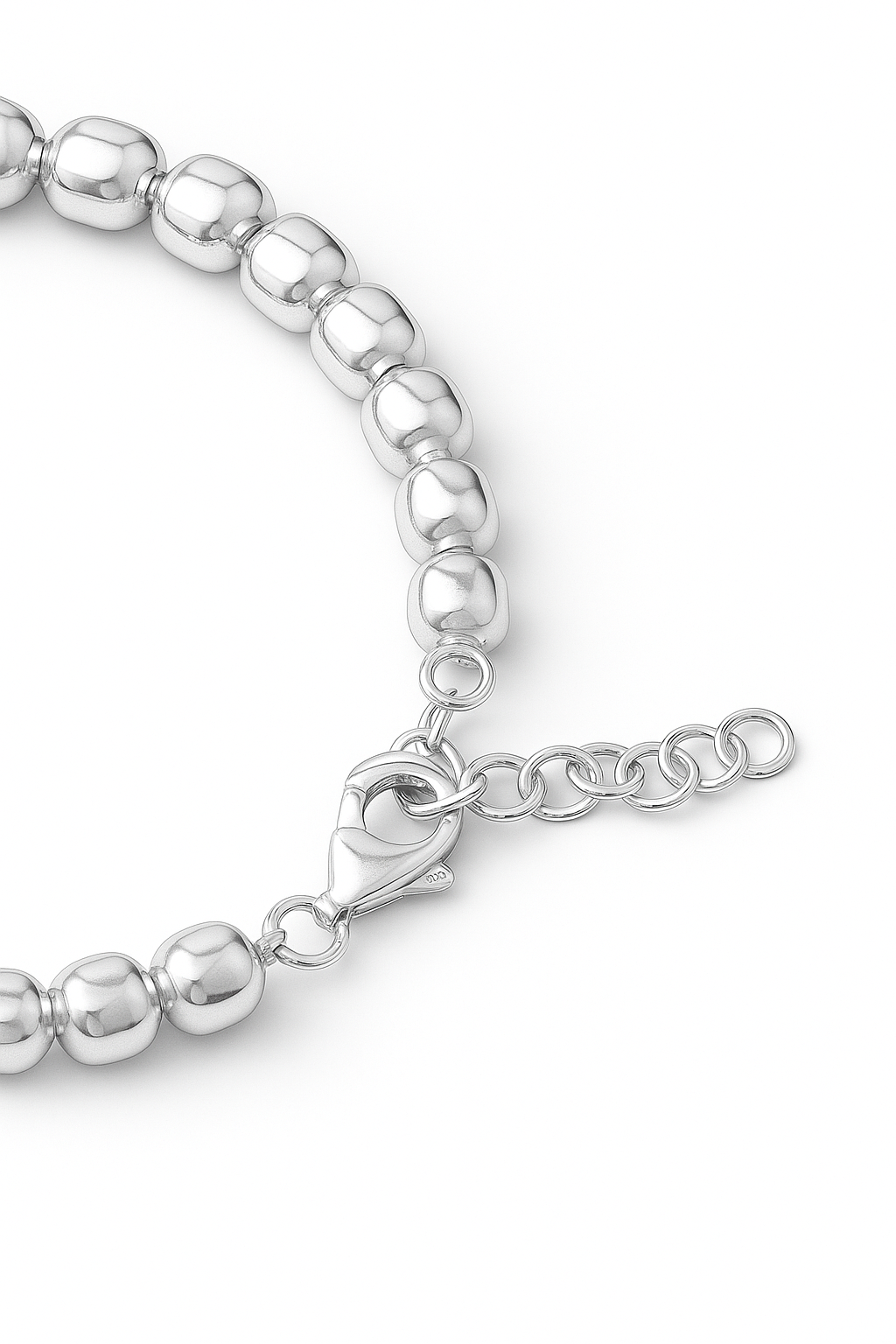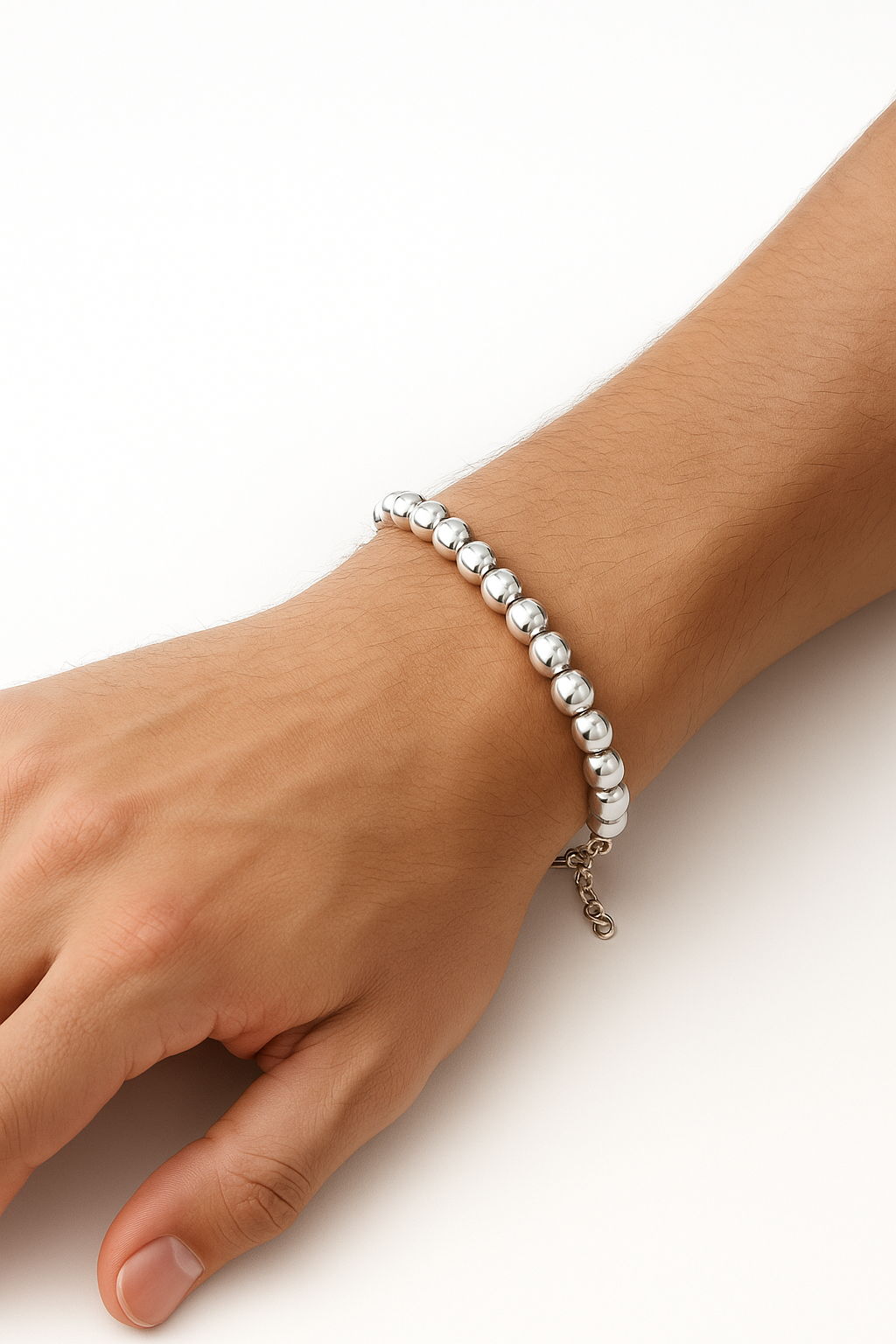 La Pulsera Mateo destaca por su diseño clásico y versátil de esferas pulidas en plata 925, que reflejan la luz con un brillo impecable.