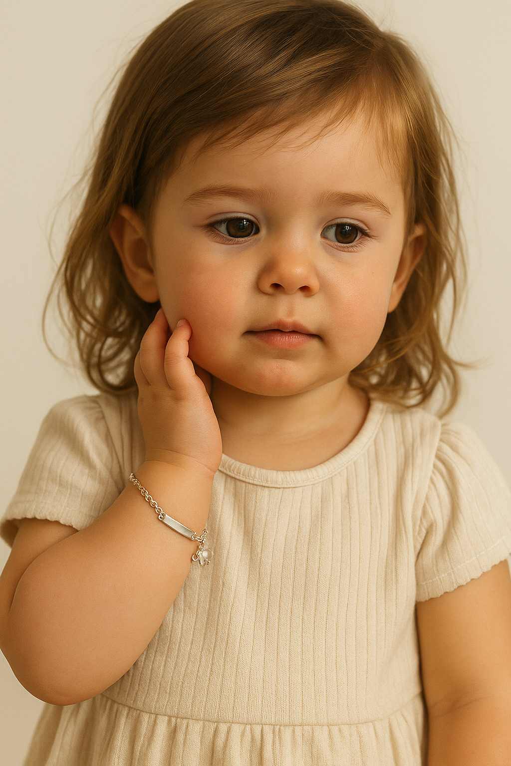 Su plaquita central personalizable permite grabar un nombre o fecha especial, convirtiéndola en un regalo ideal para recién nacidos, niños o primeros recuerdos familiares.