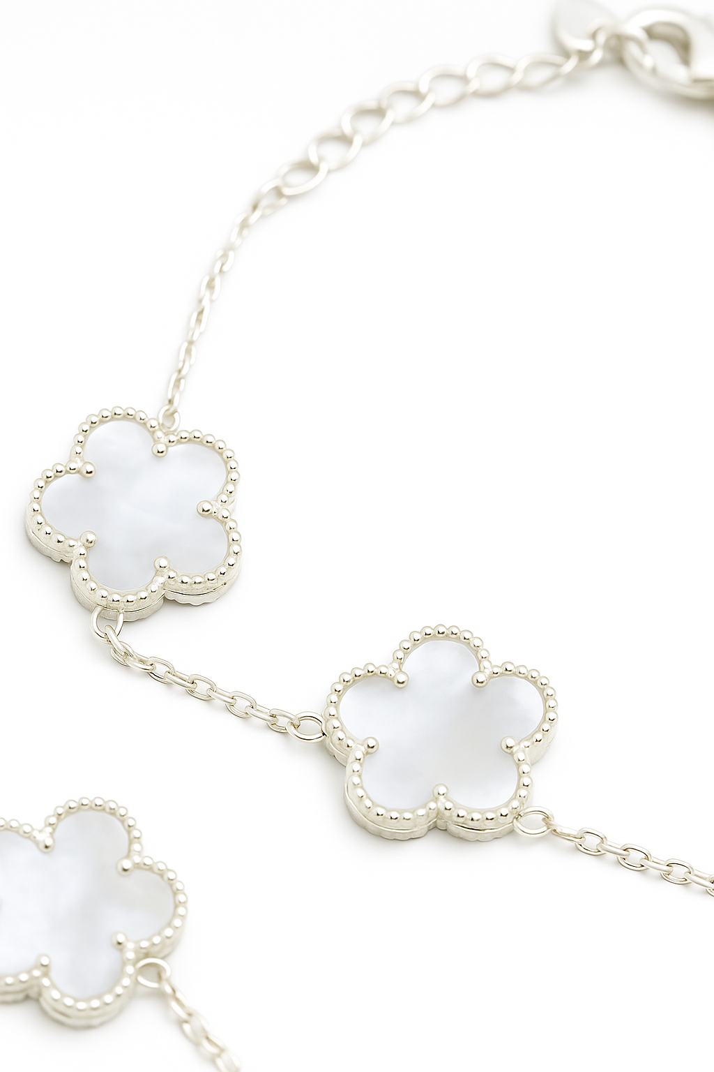 La Pulsera Sirel está elaborada en Plata 925 con cinco delicadas flores de nácar natural, cuidadosamente enmarcadas en bordes texturizados que realzan su brillo natural.